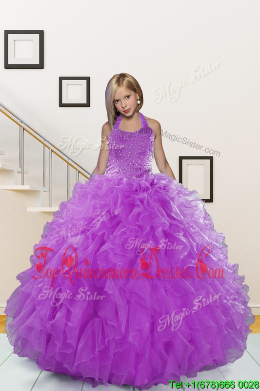 Luxurious Halter Top Organza Sleeveless Floor Length Glitz Pageant Dress and Beading and Ruffles