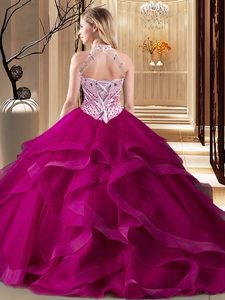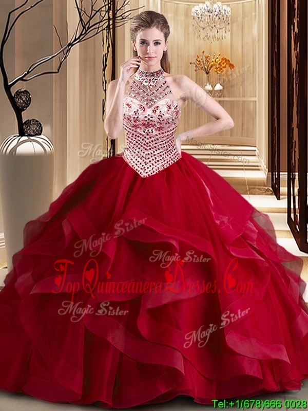 Luxurious Halter Top Wine Red Tulle Lace Up Quinceanera Gowns Sleeveless With Brush Train Beading and Ruffles