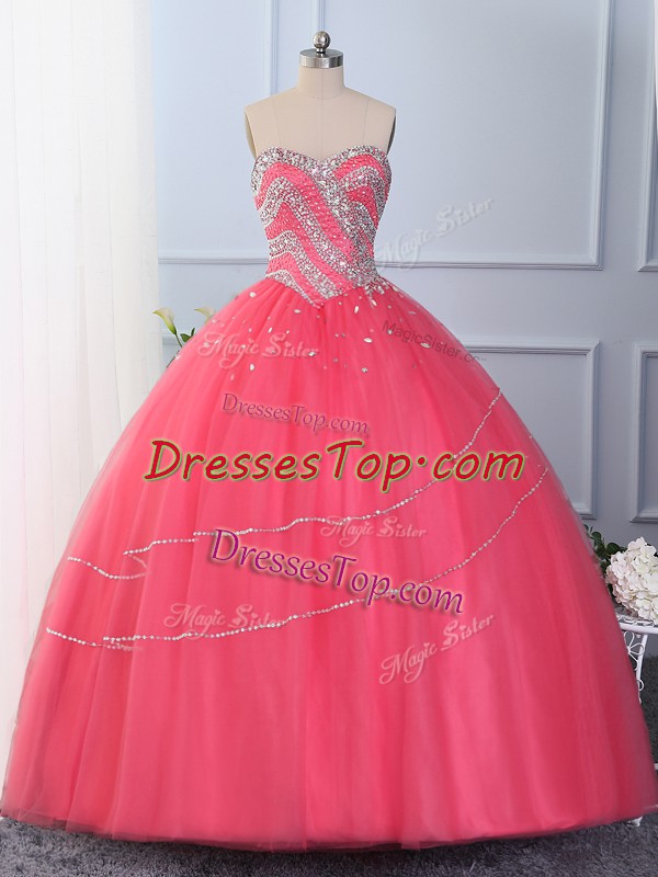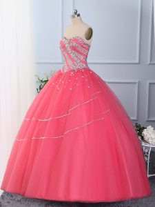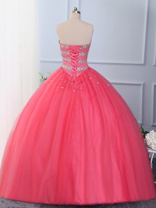 Luxurious Hot Pink Ball Gowns Tulle Sweetheart Sleeveless Beading Floor Length Lace Up Quinceanera Gowns