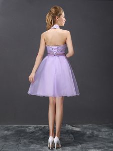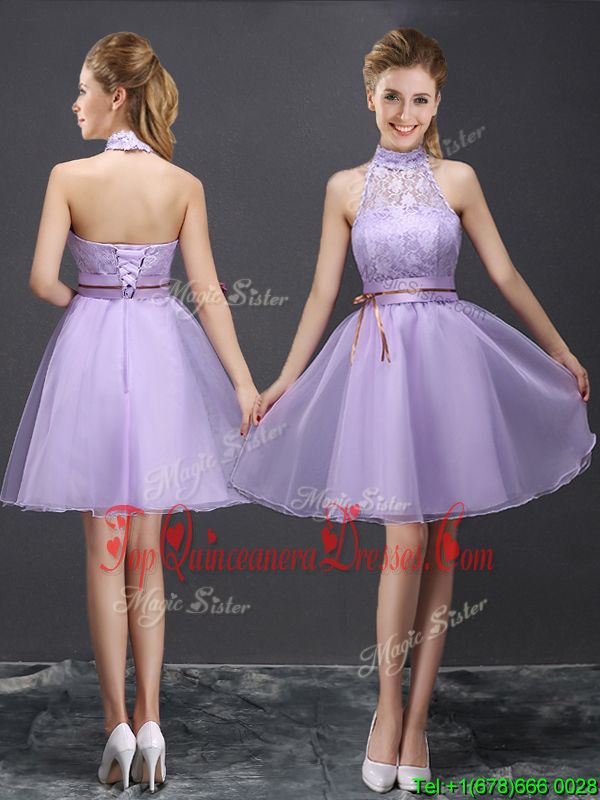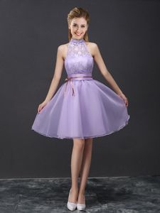 Luxurious Lavender Organza Lace Up Halter Top Sleeveless Mini Length Quinceanera Court of Honor Dress Lace and Belt