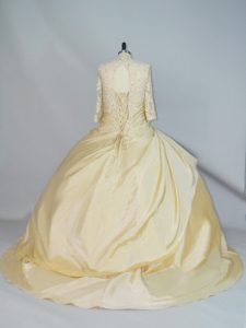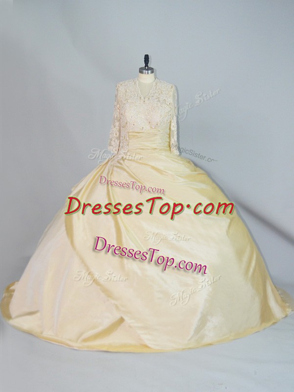 Luxurious Long Sleeves Taffeta Brush Train Lace Up Quince Ball Gowns in Yellow with Lace