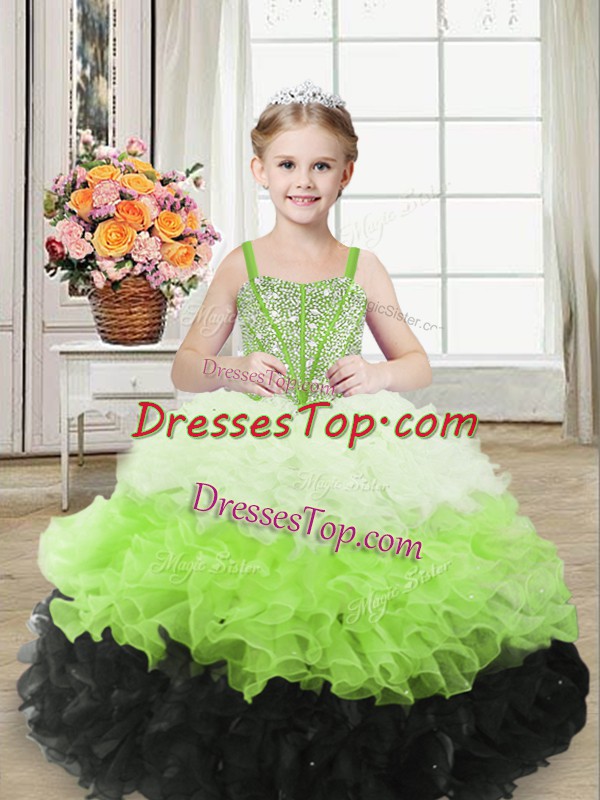 Luxurious Multi-color Ball Gowns Organza One Shoulder Sleeveless Beading and Ruffles Floor Length Zipper Little Girl Pageant Dress