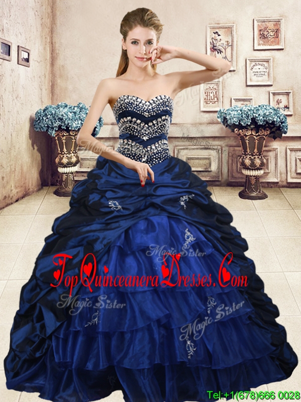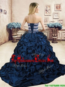 Luxurious Navy Blue Brush Train Quinceanera Dress with Beading and Pick Ups