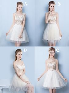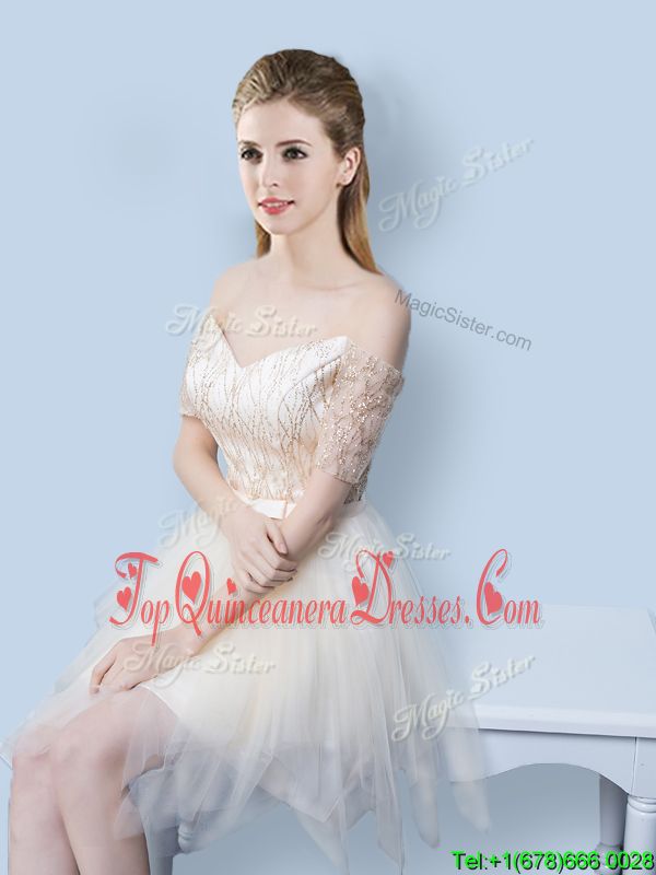 Luxurious Off The Shoulder Short Sleeves Tulle Court Dresses for Sweet 16 Sequins and Bowknot Lace Up