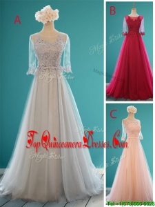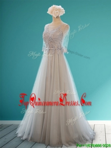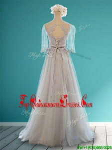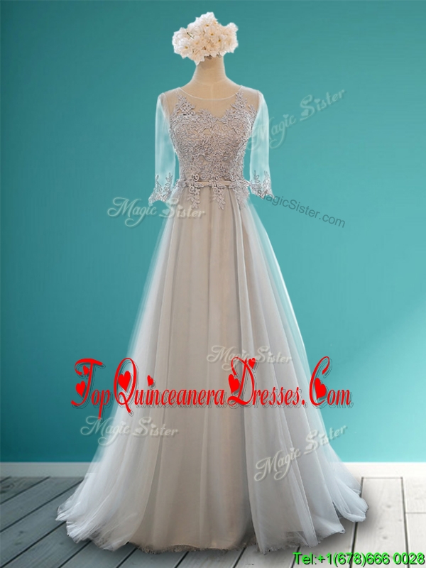 Luxurious Scoop Half Sleeves Grey Damas Dress with Appliques and Belt