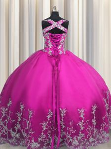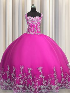 Luxurious Sleeveless Floor Length Beading and Appliques Lace Up Quince Ball Gowns with Fuchsia