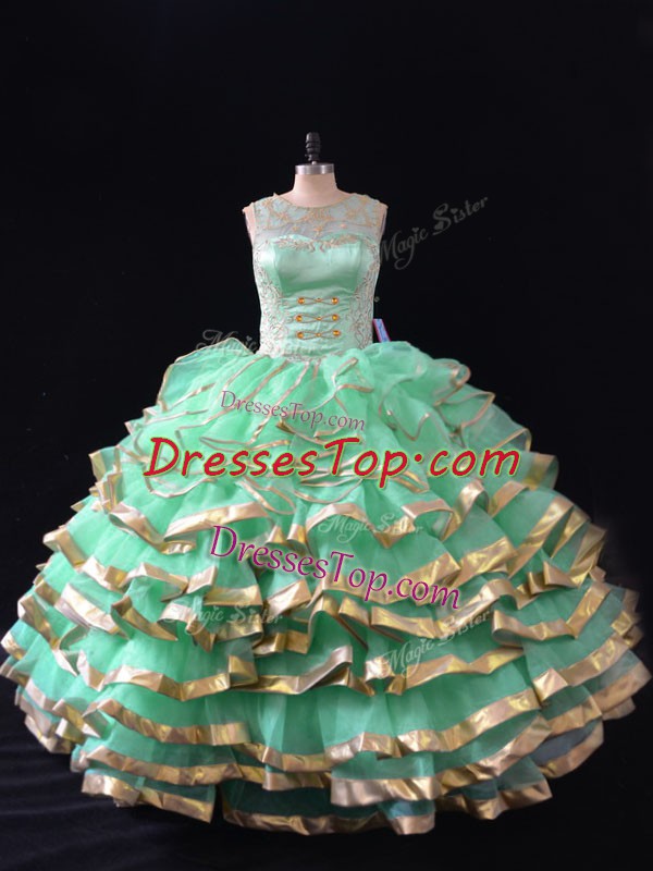Luxurious Sleeveless Organza Floor Length Lace Up Ball Gown Prom Dress in Apple Green with Ruffles