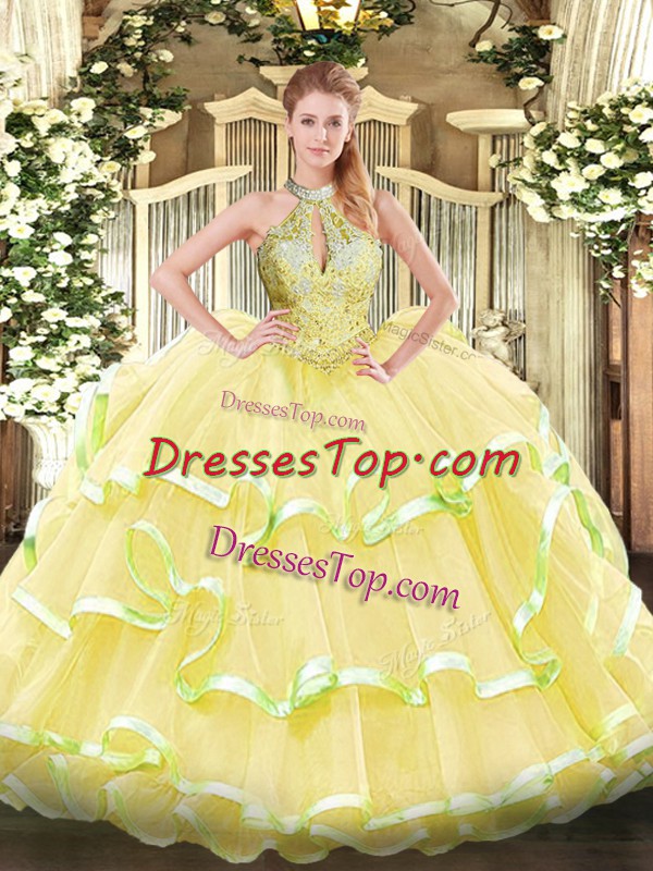 Luxurious Yellow Ball Gowns Beading and Ruffled Layers Sweet 16 Dress Lace Up Organza Sleeveless Floor Length