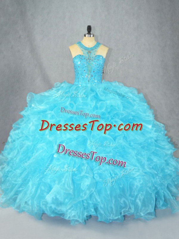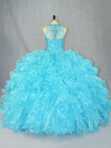 Luxury Baby Blue Ball Gowns Organza Scoop Sleeveless Beading and Ruffles Floor Length Zipper 15 Quinceanera Dress