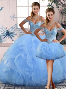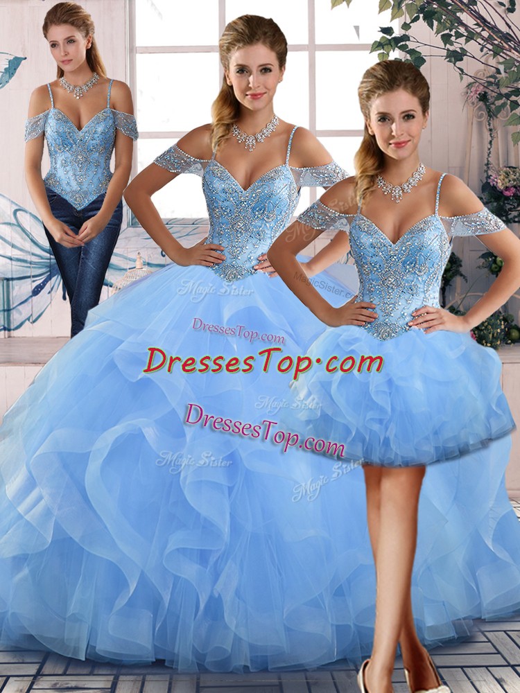 Luxury Beading and Ruffles Sweet 16 Dresses Blue Lace Up Sleeveless Floor Length