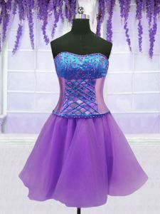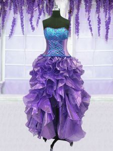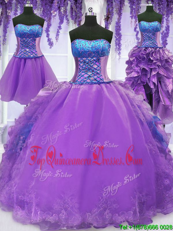 Luxury Four Piece Lavender Lace Up Strapless Embroidery and Ruffles Quince Ball Gowns Organza Sleeveless