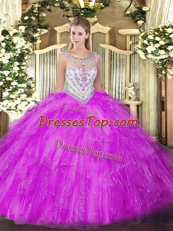 Luxury Fuchsia Ball Gowns Tulle Scoop Sleeveless Beading and Ruffles Floor Length Zipper 15 Quinceanera Dress