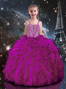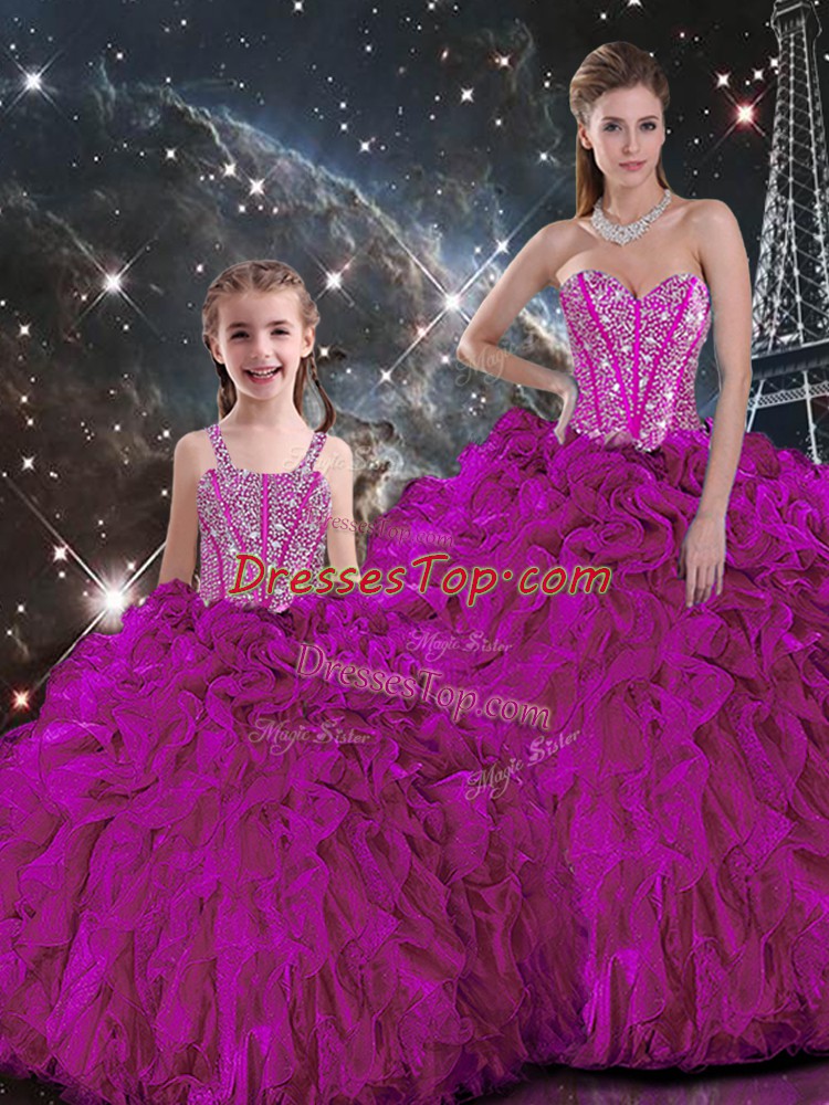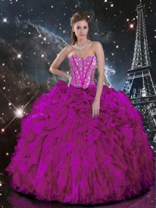 Luxury Fuchsia Organza Lace Up Sweetheart Sleeveless Floor Length Ball Gown Prom Dress Beading and Ruffles