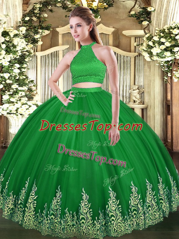 Luxury Green Halter Top Backless Beading and Appliques Quince Ball Gowns Sleeveless