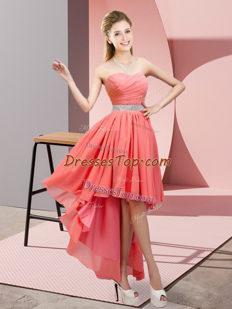 Luxury High Low Lace Up Damas Dress Watermelon Red for Prom and Party and Wedding Party with Beading