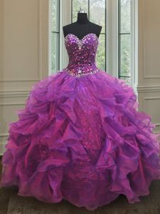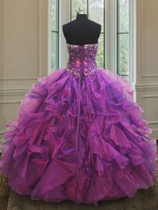 Luxury Purple Ball Gowns Organza Sweetheart Sleeveless Beading and Ruffles and Sequins Floor Length Lace Up Sweet 16 Dresses