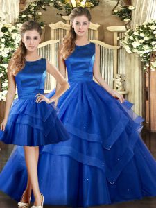 Luxury Royal Blue Three Pieces Tulle Scoop Sleeveless Ruffled Layers Floor Length Lace Up Vestidos de Quinceanera