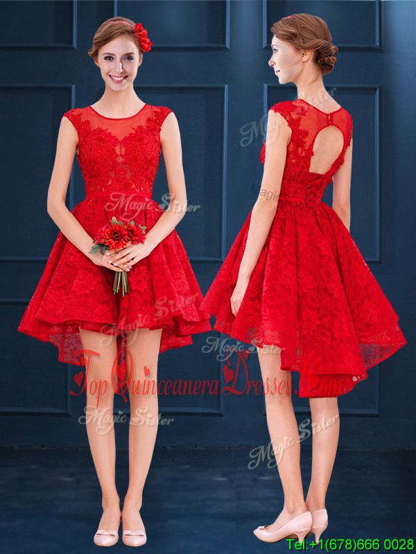 Luxury Scoop Sleeveless High Low Lace Lace Up Quinceanera Court of Honor Dress with Red