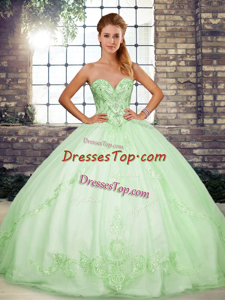 Modern Apple Green Ball Gowns Beading and Embroidery Sweet 16 Dress Lace Up Tulle Sleeveless Floor Length