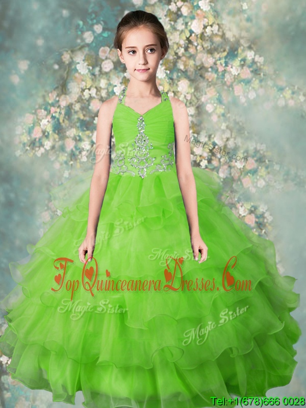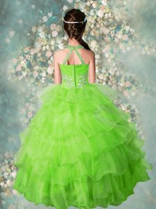 Modern Apple Green Organza Zipper Halter Top Sleeveless Floor Length Pageant Gowns For Girls Beading and Ruffled Layers