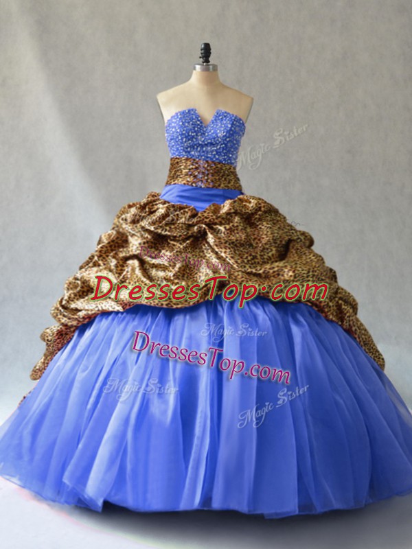 Modern Blue Ball Gowns V-neck Sleeveless Organza and Printed Brush Train Lace Up Beading and Pick Ups Quinceanera Gown