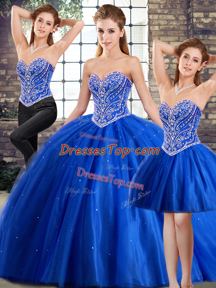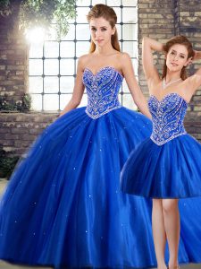 Modern Blue Sleeveless Tulle Brush Train Lace Up 15 Quinceanera Dress for Military Ball and Sweet 16 and Quinceanera