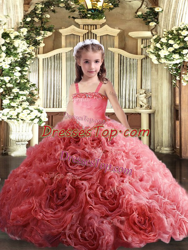 Modern Coral Red Ball Gowns Fabric With Rolling Flowers Straps Sleeveless Appliques Floor Length Lace Up Pageant Dress Wholesale