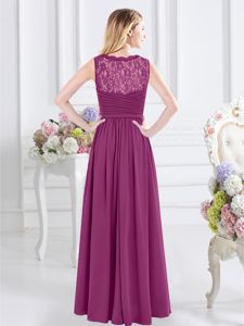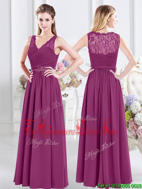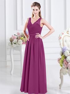 Modern Floor Length Fuchsia Dama Dress V-neck Sleeveless Side Zipper