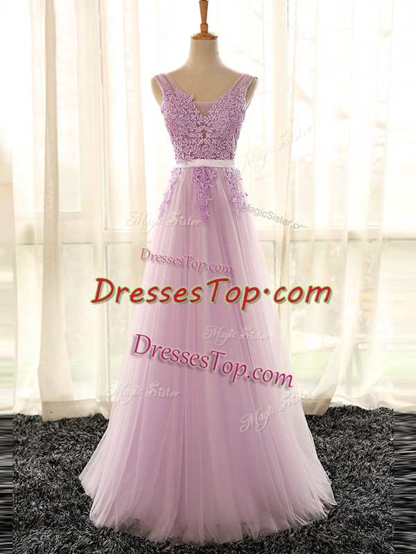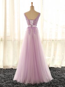 Modern Floor Length Lace Up Quinceanera Court of Honor Dress Lilac for Prom and Party and Wedding Party with Appliques