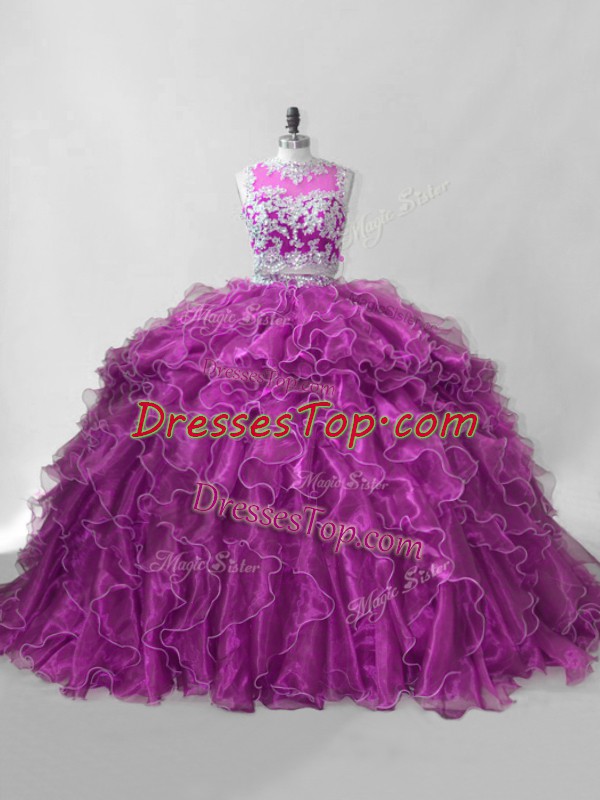 Modern Fuchsia Sweet 16 Quinceanera Dress Sweet 16 and Quinceanera with Beading and Ruffles Scoop Sleeveless Brush Train Zipper