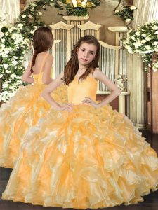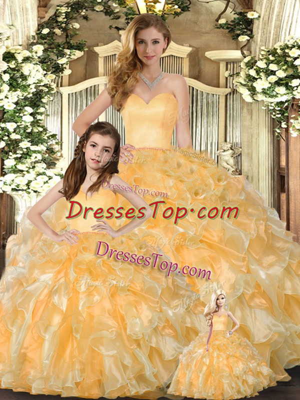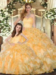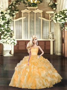 Modern Gold Sleeveless Floor Length Beading and Ruffles Lace Up Ball Gown Prom Dress