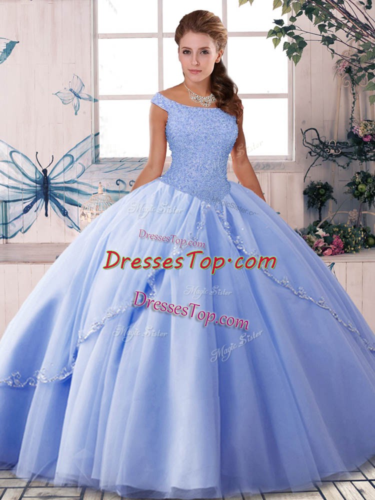Modern Lavender Ball Gowns Off The Shoulder Sleeveless Tulle Brush Train Lace Up Beading Sweet 16 Dresses