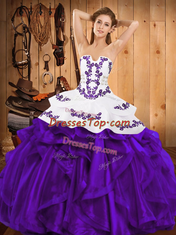 Modern Purple Strapless Lace Up Embroidery and Ruffles Quince Ball Gowns Sleeveless