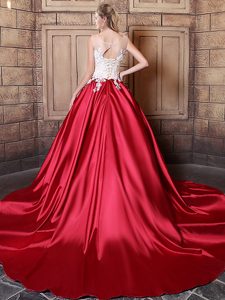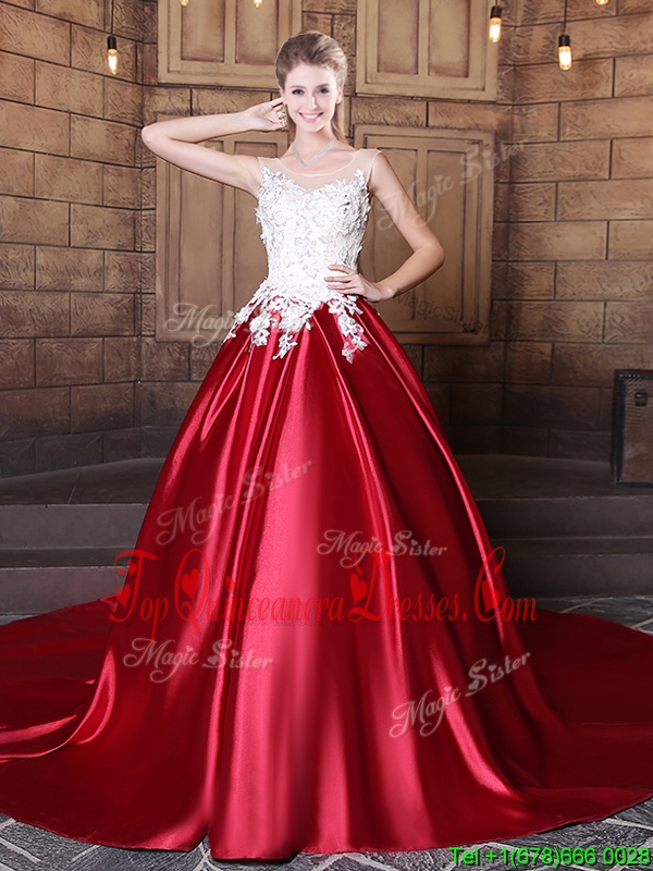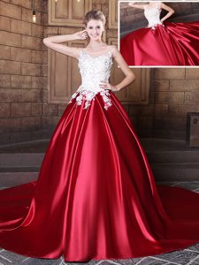 Modern Scoop Wine Red Elastic Woven Satin Lace Up 15 Quinceanera Dress Sleeveless Floor Length Lace and Appliques