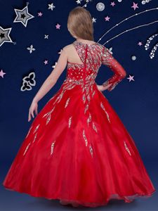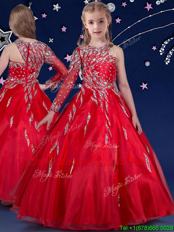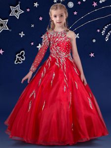 Modern Sleeveless Floor Length Beading and Ruffles Zipper Little Girls Pageant Dress Wholesale with Red
