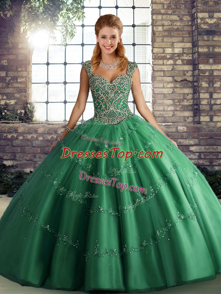 Modern Straps Sleeveless Lace Up Quinceanera Gown Green Tulle