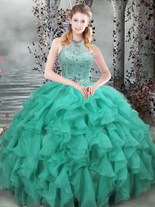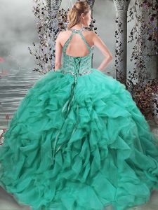 Modern Turquoise Quinceanera Dresses Military Ball and Sweet 16 and Quinceanera with Beading and Ruffles Scoop Sleeveless Brush Train Lace Up