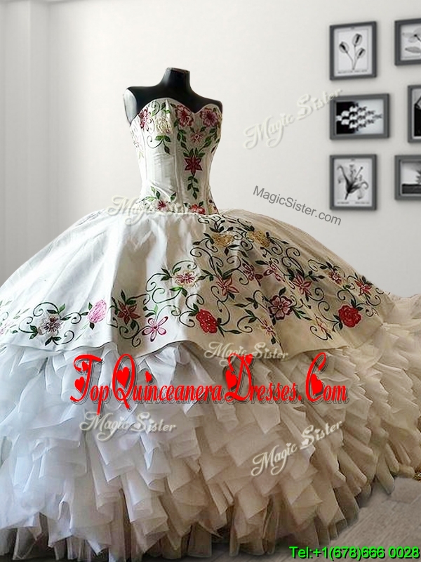 Modern White Big Puffy Quinceanera Dress with Embroidery and Ruffles