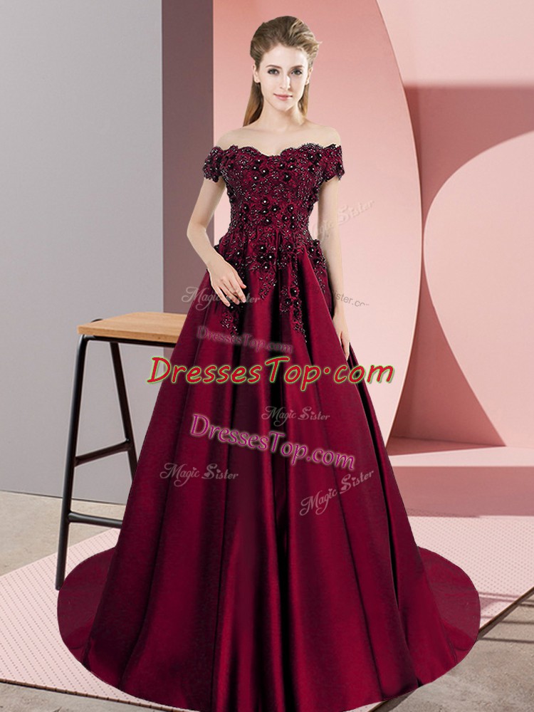 Modern Wine Red Zipper Off The Shoulder Appliques Quince Ball Gowns Satin Sleeveless Court Train