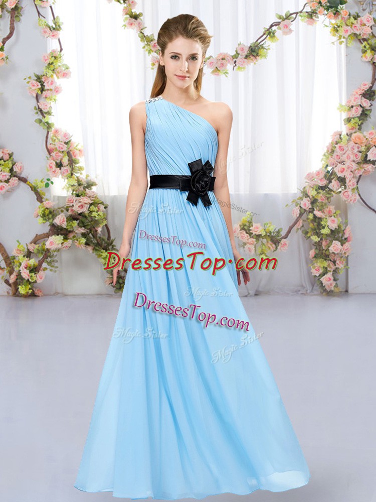 Modest Aqua Blue Chiffon Zipper One Shoulder Sleeveless Floor Length Court Dresses for Sweet 16 Belt