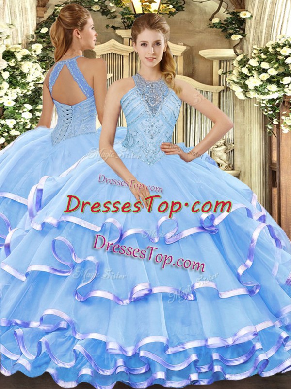 Modest Aqua Blue Halter Top Neckline Beading and Ruffled Layers Quince Ball Gowns Sleeveless Lace Up