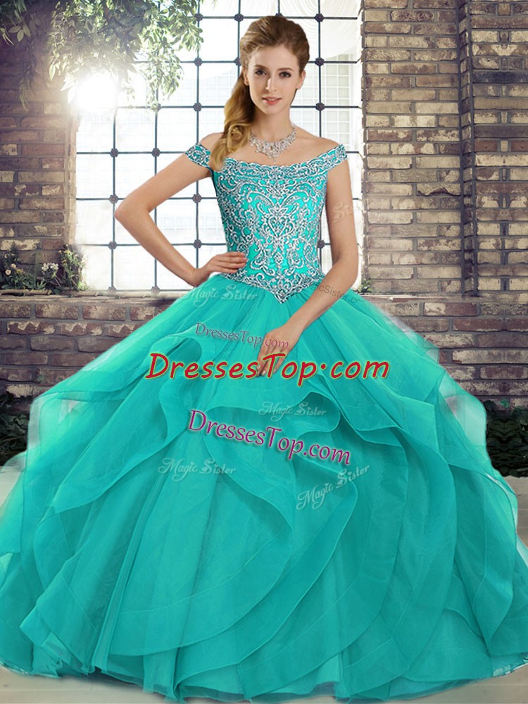 Modest Aqua Blue Off The Shoulder Lace Up Beading and Ruffles Sweet 16 Quinceanera Dress Brush Train Sleeveless