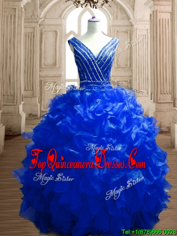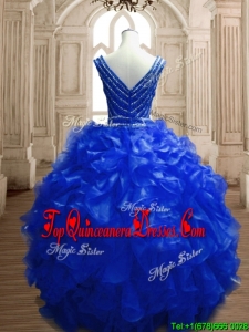 Modest Beaded and Ruffled Deep V Neckline Quinceanera Dress in Royal Blue