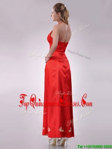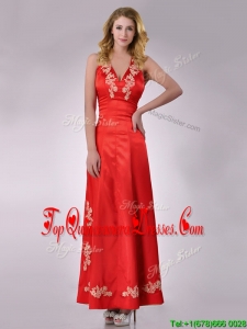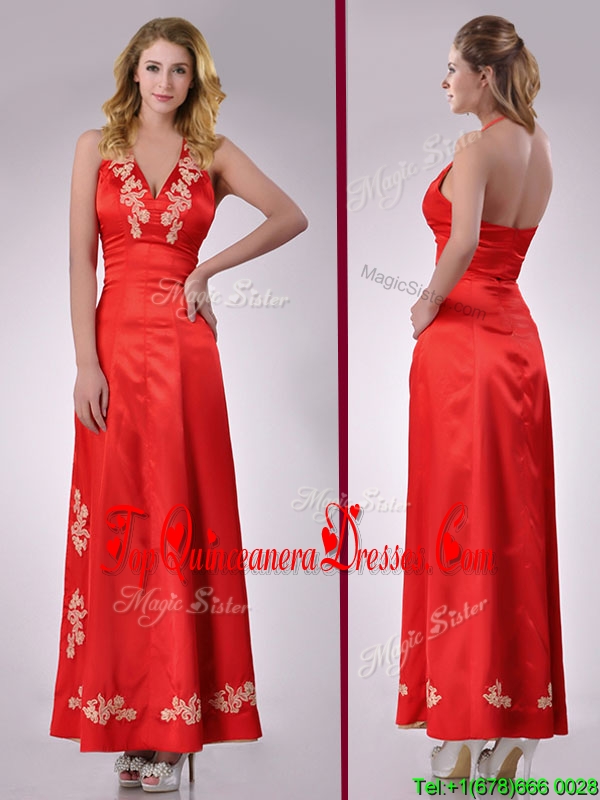 Modest Column Halter Top Backless Red Dama Dress with Appliques