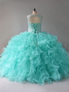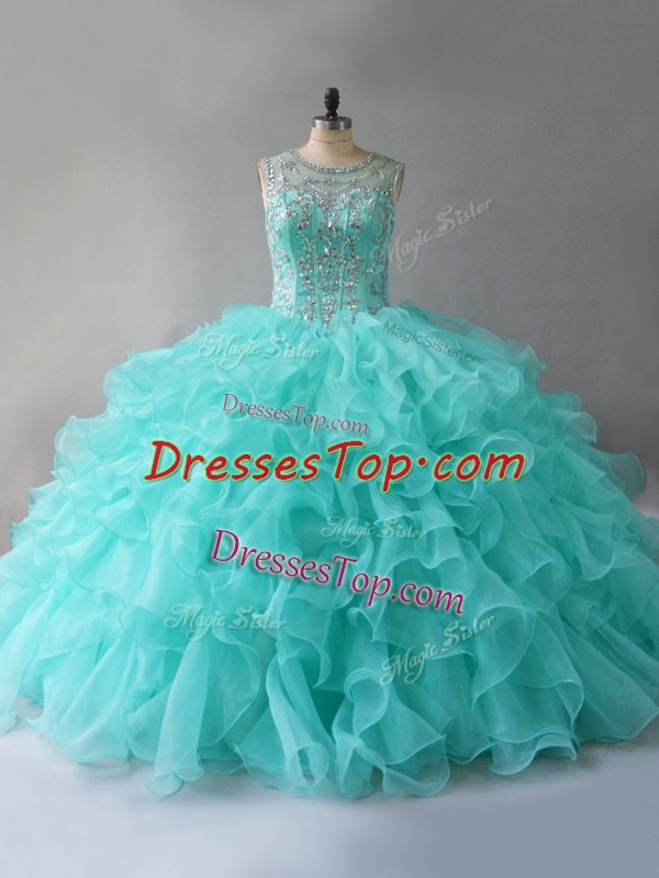 Modest Floor Length Aqua Blue 15 Quinceanera Dress Organza Sleeveless Beading and Ruffles