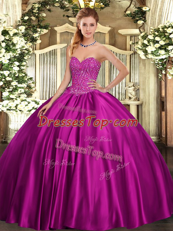 Modest Fuchsia Lace Up Sweet 16 Dress Beading Sleeveless Floor Length