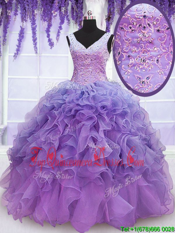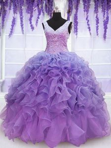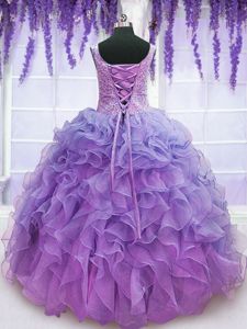 Modest Lavender Lace Up Sweet 16 Dress Beading and Embroidery and Ruffles Sleeveless Floor Length