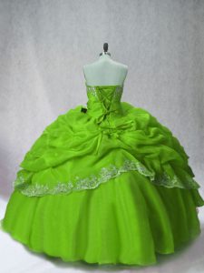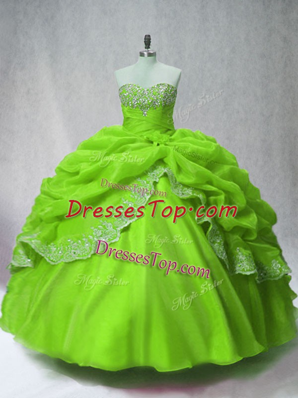 Modest Long Sleeves Organza Floor Length Lace Up Quinceanera Dresses in Green with Beading and Appliques and Pick Ups