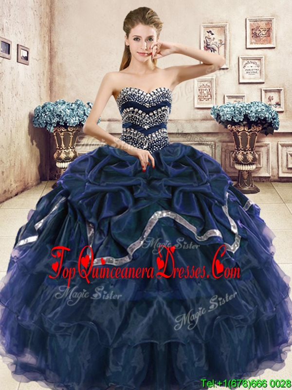 Modest Navy Blue Organza Quinceanera Dress with Beading and Pick Ups