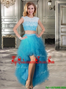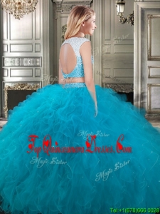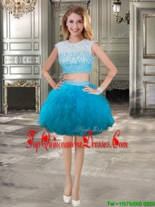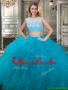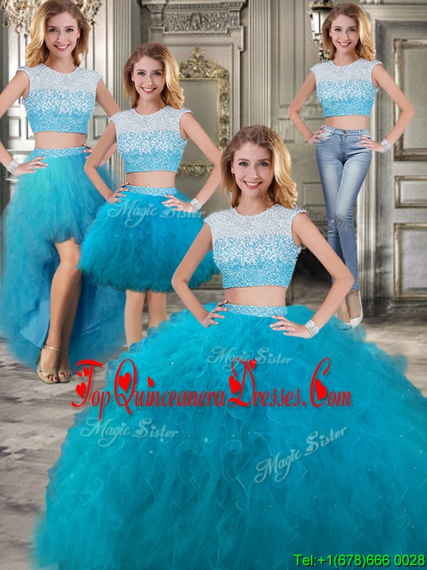 Modest Scoop Cap Sleeves Teal Detachable Sweet 16 Dresses with Beading and Ruffles